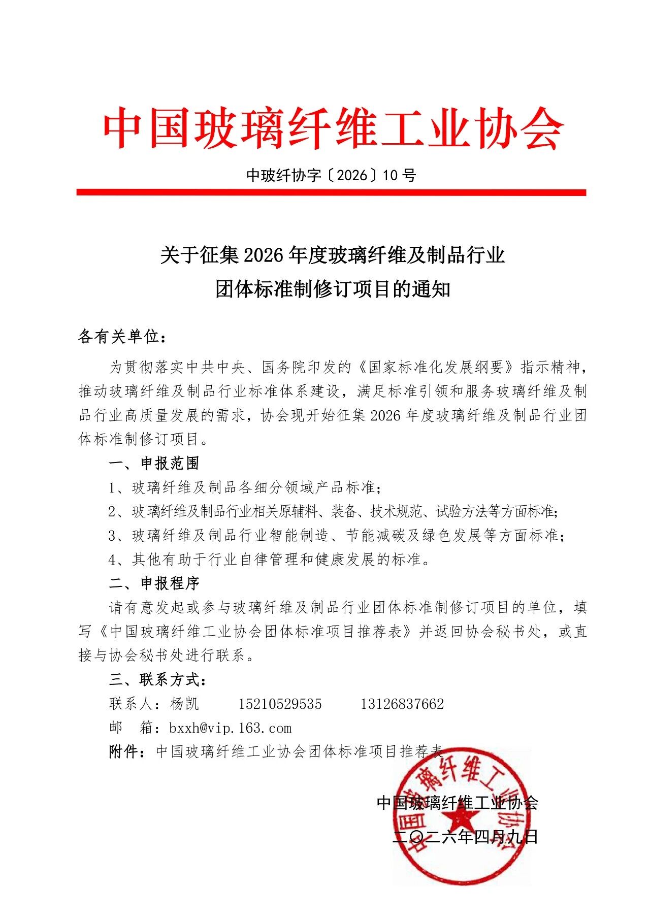 关于征集2026年度玻璃纤维及制品行业团体标准制修订项目的通知