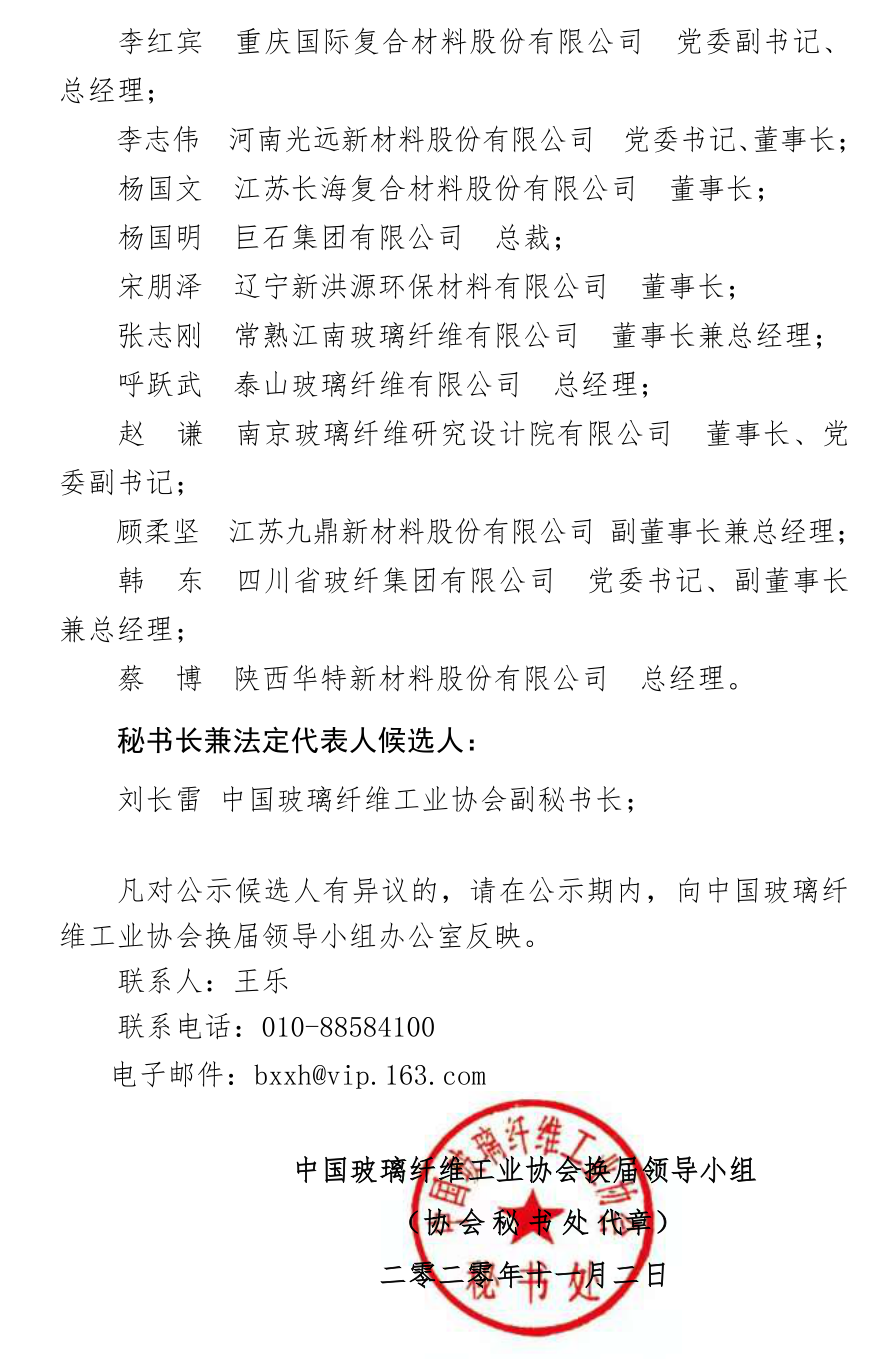 经报中国建筑材料联合会审核同意,现将中国玻璃纤维工业协会第五届理事会负责人候选人名单进行公示,公示期为2020年11月2日至11月8日,共计7天。