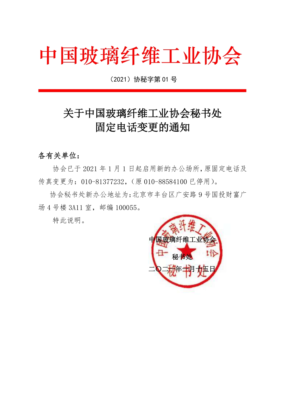 关于中国玻璃纤维工业协会秘书处固定电话变更的通知