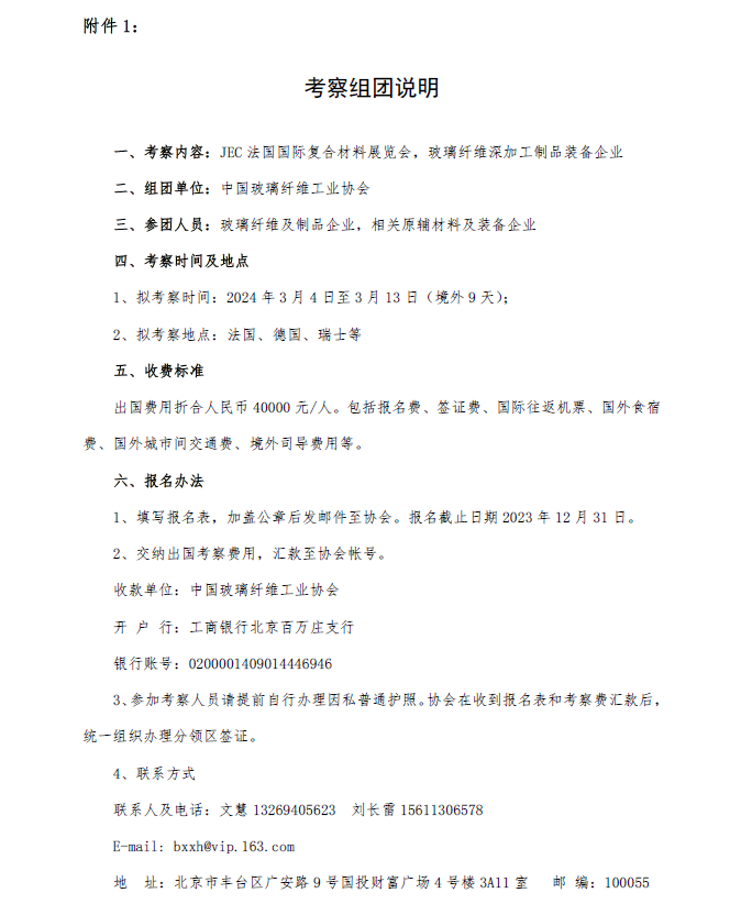 为了解全球玻璃纤维复合材料行业整体走势,推动我国玻璃纤维及制品行业高质量发展,积极开辟发展新领域新赛道,中国玻璃纤维工业协会定于2024年3月上旬,组团参观2024年JEC法国国际复合材料展览会(JEC World)。