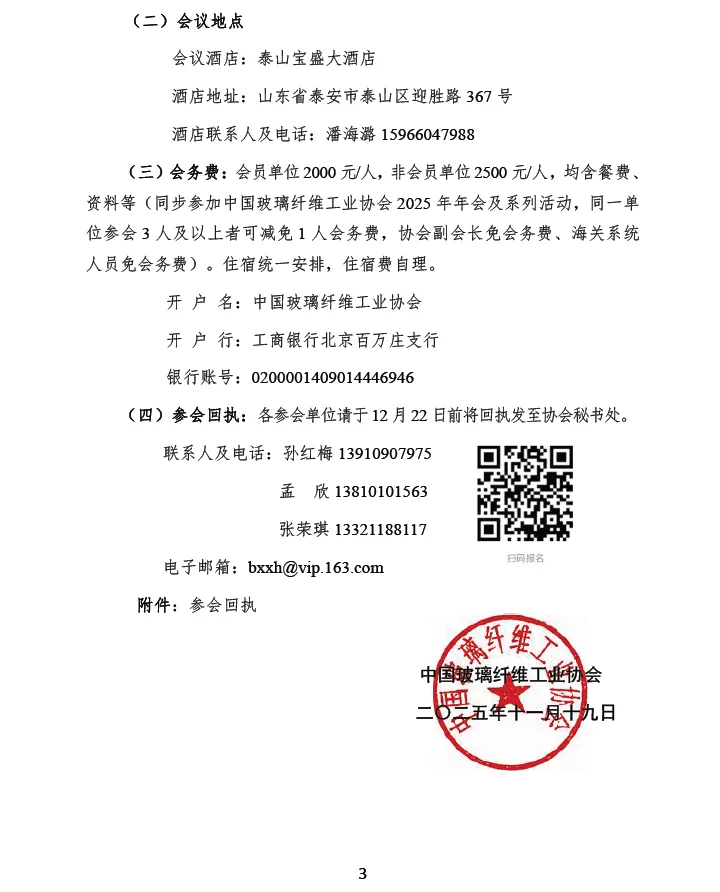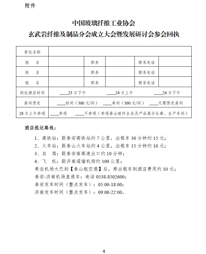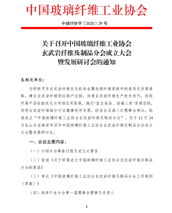为积极寻求玄武岩纤维在无机非金属连续纤维家族中的差异化发展道路,健全玄武岩纤维供应链产业链,加速玄武岩纤维生产技术迭代,协同开展产品性能优化与市场应用拓展,践行“宜业尚品、造福人类”发展目标,实现玄武岩纤维细分行业健康有序发展,经协会五届八次理事会审议,批准成立“中国玻璃纤维工业协会玄武岩纤维及制品分会”。现定于12月24日在山东省泰安市召开中国玻璃纤维工业协会玄武岩纤维及制品分会成立大会暨发展研讨会。具体事宜通知如下: