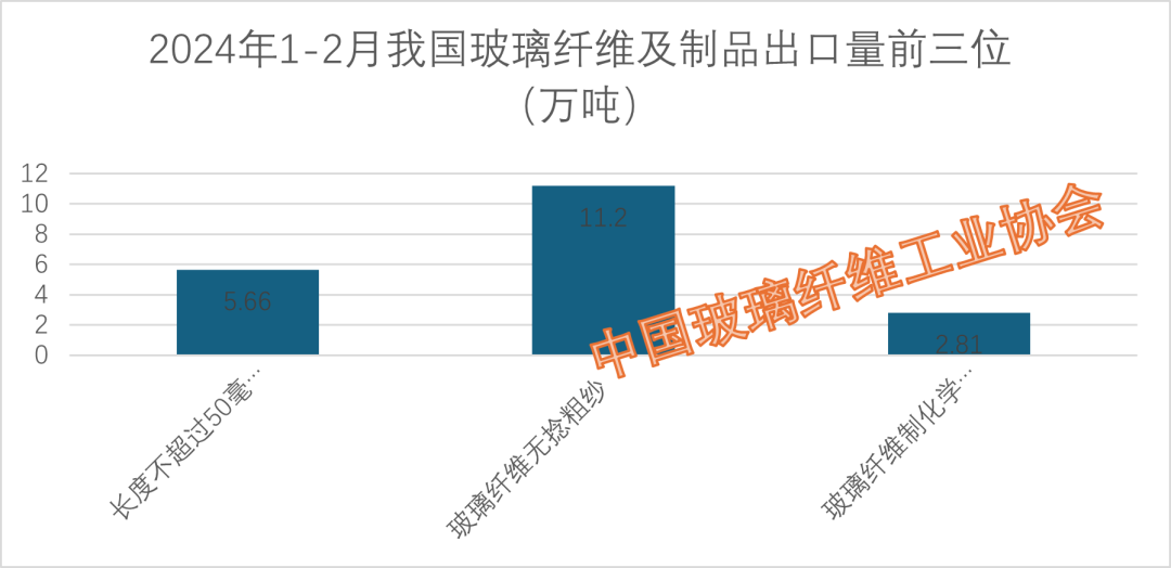 31项具体税目产品中:1-2月出口量位列前三位的依次是玻璃纤维无捻粗纱、长度不超过50毫米的玻璃纤维短切原丝、玻璃纤维制化学结合毡,三类产品的出口量分别为11.20万吨、5.66万吨、2.81万吨。三项产品出口量合计为19.67万吨,占总出口量的52.06%。