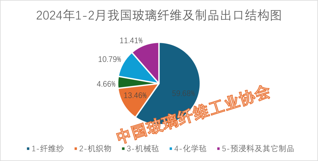 出口产品构成方面:商品纱、机织物、机械毡、化学毡、预浸料及其他制品五大类别产品,2024年度1-2月累计出口量分别为13.84万吨、6.90万吨、3.50万吨、4.03万吨、15.24万吨,占比分别达到59.68%、13.46%、4.66%、10.79%、11.41%。