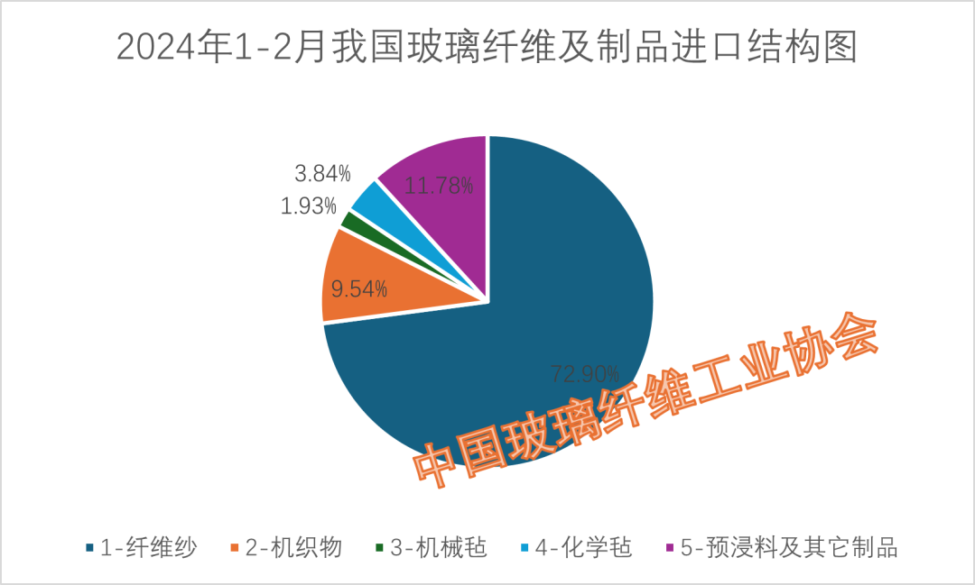 进口产品构成方面:商品纱、机织物、机械毡、化学毡、预浸料及其他制品五大类别产品,1-2月累计进口量分别为11151.75吨、1459.97吨、294.74吨、587.75吨、1802.08吨,分别占比74.47%、10.02%、0.95%、4.28%、10.27%。