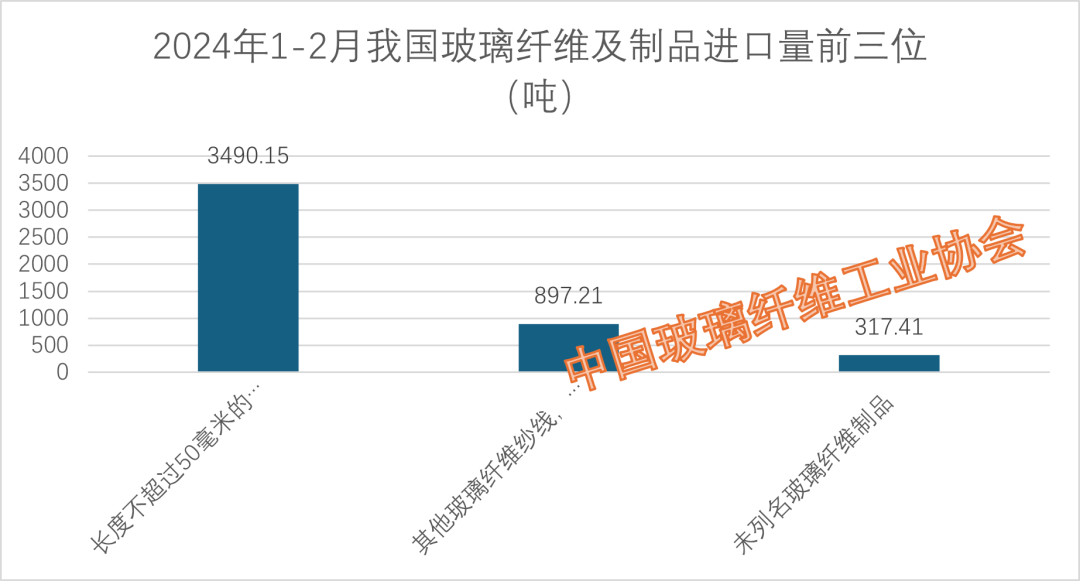31项具体税目产品中:2月单月进口量位列前三名的是:长度不超过50毫米的玻璃纤维短切原丝;其他玻璃纤维纱线,定长纤维纱条;未列名玻璃纤维制品。三类产品的进口量分别为3490.15吨、897.21吨、317.41吨。三项合计4704.77吨,占本月进口量的73.22%。