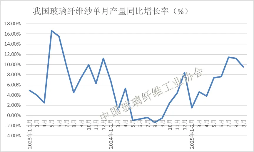 图1 我国玻璃纤维纱单月产量同比增速变化情况