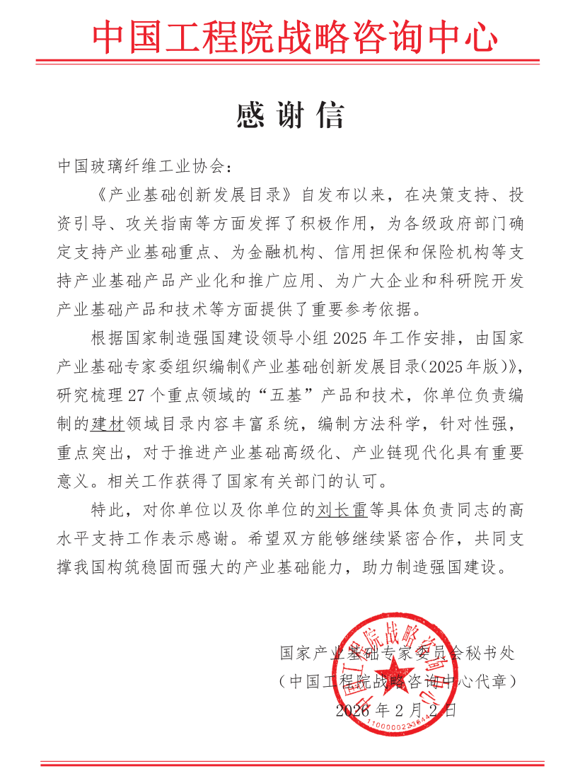 近日,协会收到中国工程战略咨询中心发来的感谢信,信中对我协会在《产业基础创新发展目录(2025年版)》的编制工作中给予的支持表示感谢。
