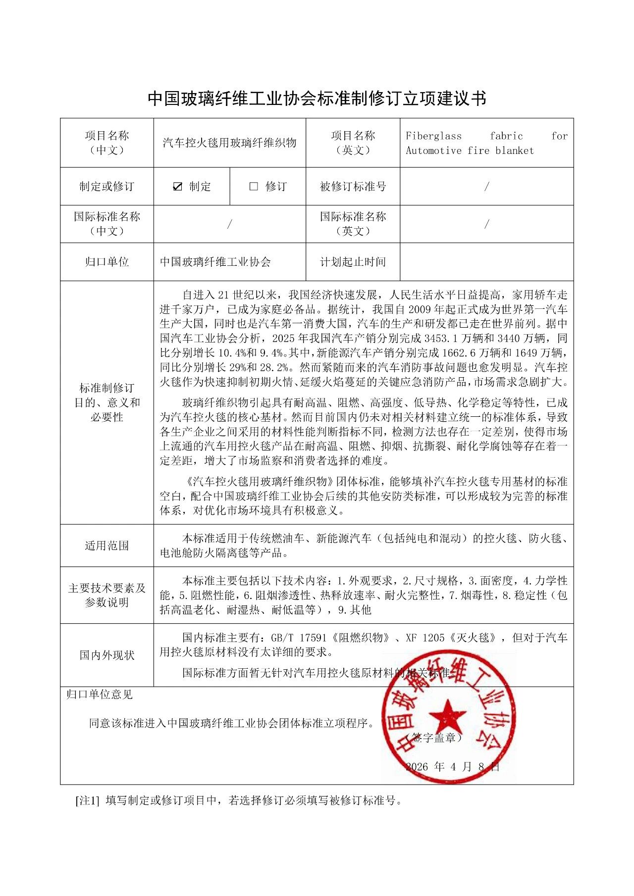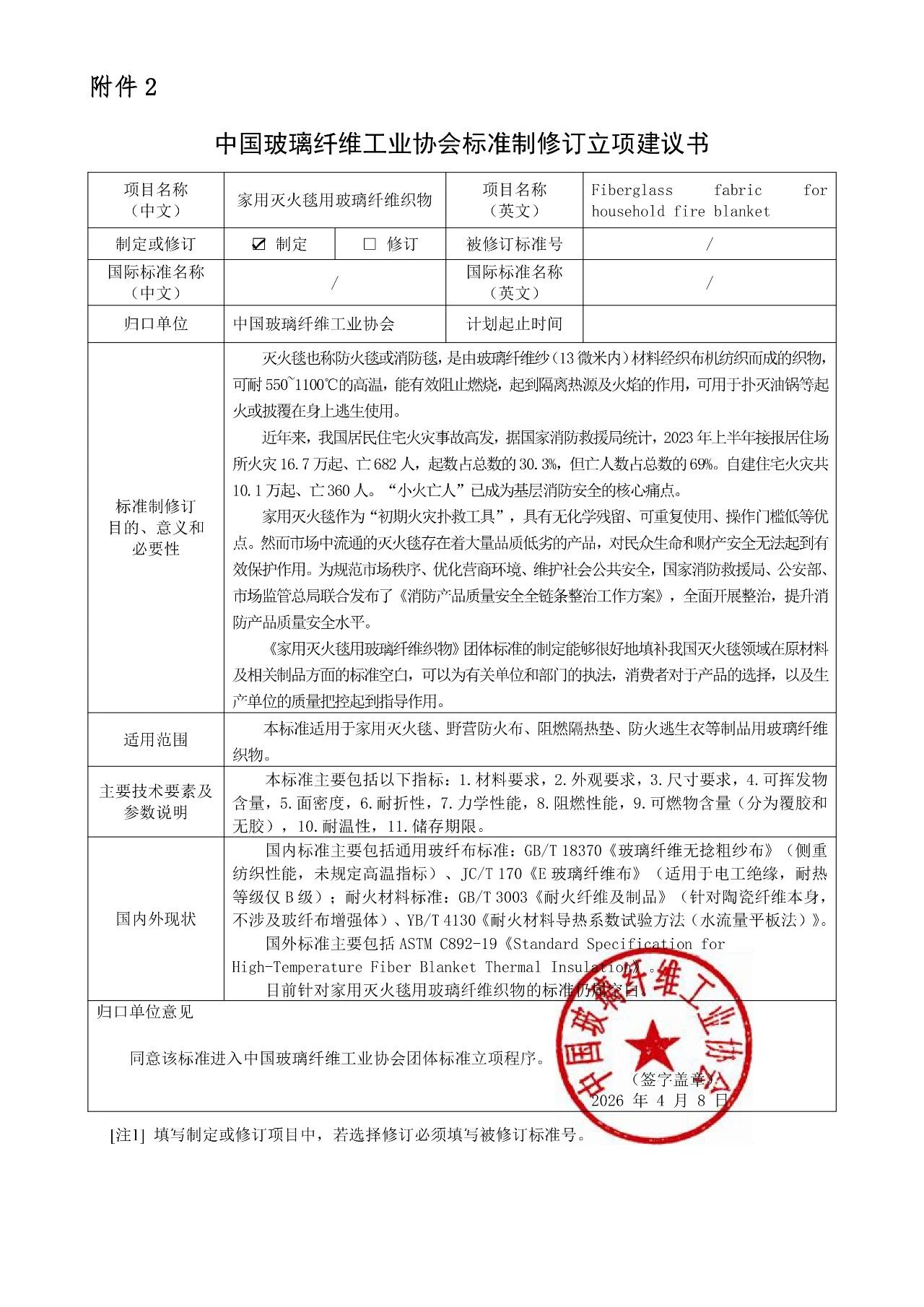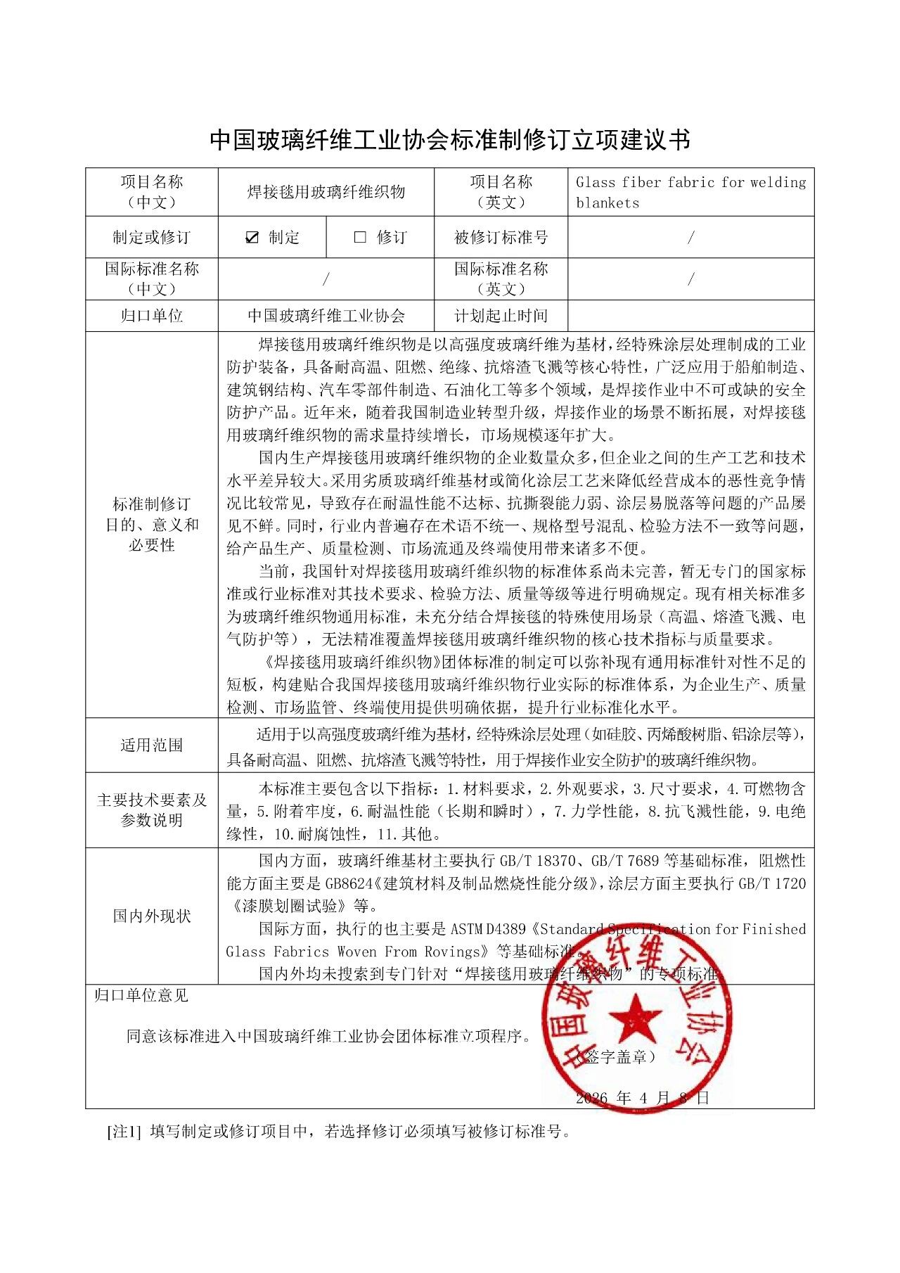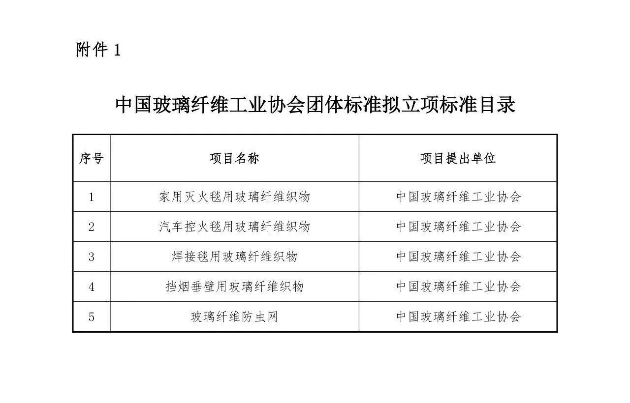依据《国务院关于印发深化标准化工作改革方案的通知》(国发〔2015〕13号)及《中国玻璃纤维工业协会团体标准管理办法》等有关要求,经前期企业建议和秘书处初步讨论,确定《家用灭火毯用玻璃纤维织物》等5项团体标准(见附件)正式进入协会团体标准立项程序。现根据程序要求,将以上标准立项申请向社会进行公示,广泛征询各方意见和建议,并征集参编单位。拟立项标准见附件1。