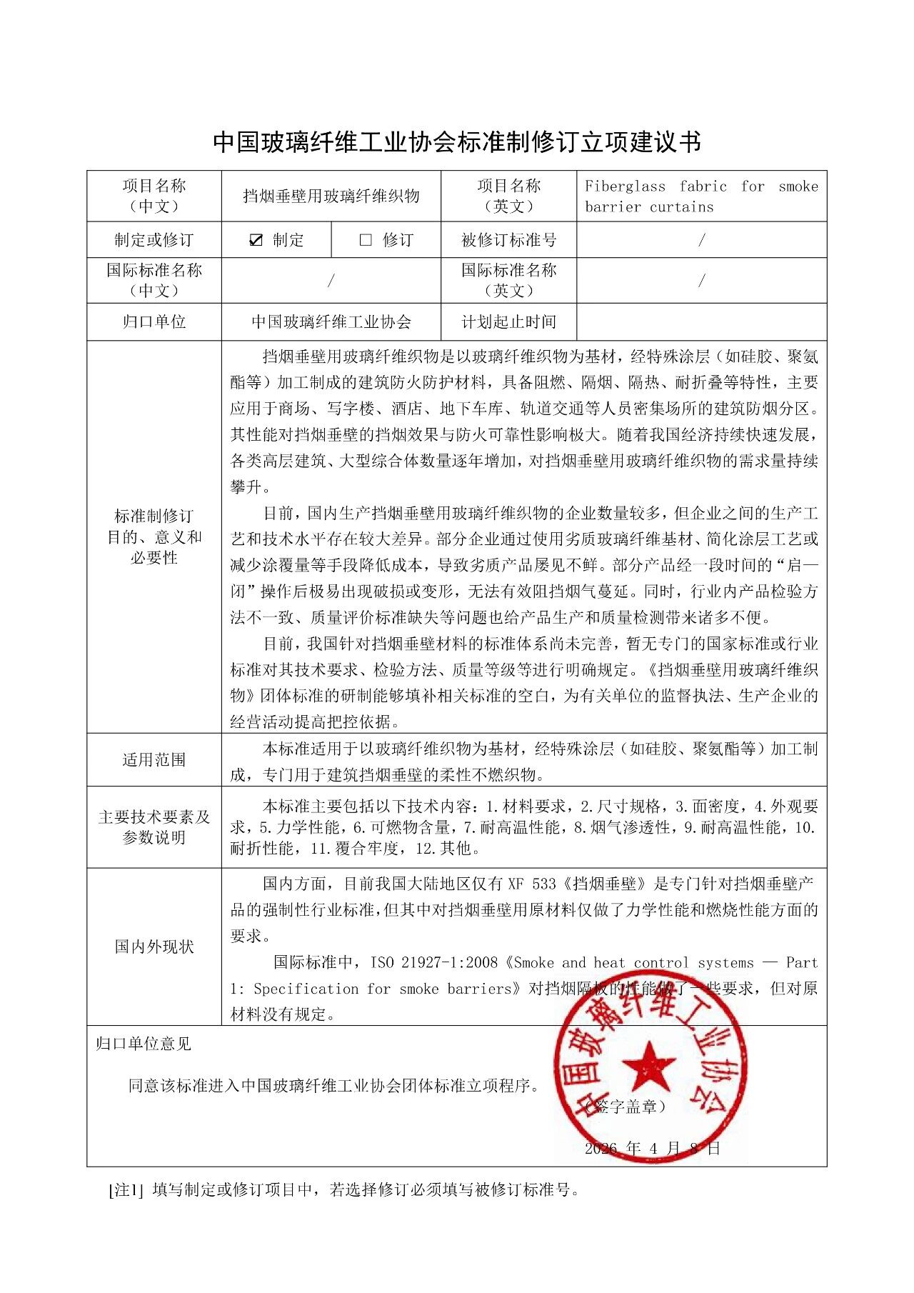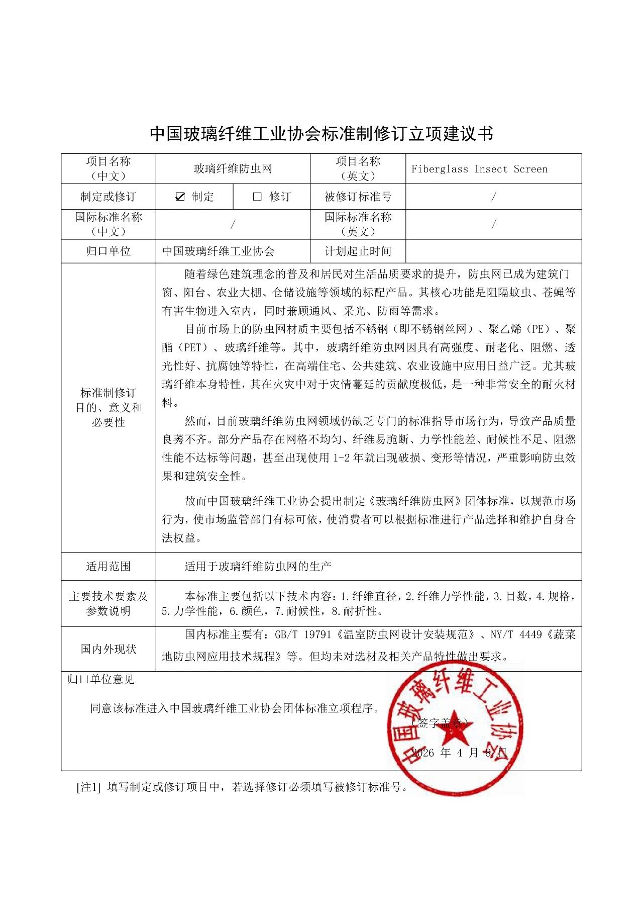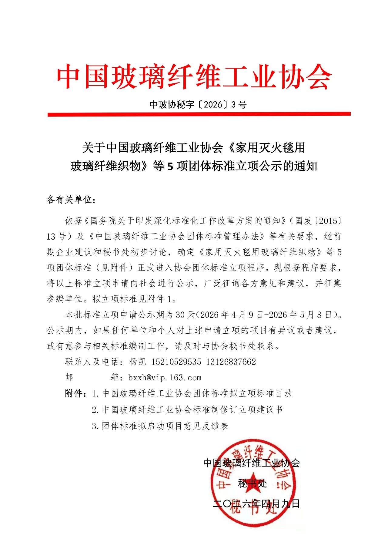 依据《国务院关于印发深化标准化工作改革方案的通知》(国发〔2015〕13号)及《中国玻璃纤维工业协会团体标准管理办法》等有关要求,经前期企业建议和秘书处初步讨论,确定《家用灭火毯用玻璃纤维织物》等5项团体标准(见附件)正式进入协会团体标准立项程序。现根据程序要求,将以上标准立项申请向社会进行公示,广泛征询各方意见和建议,并征集参编单位。拟立项标准见附件1。